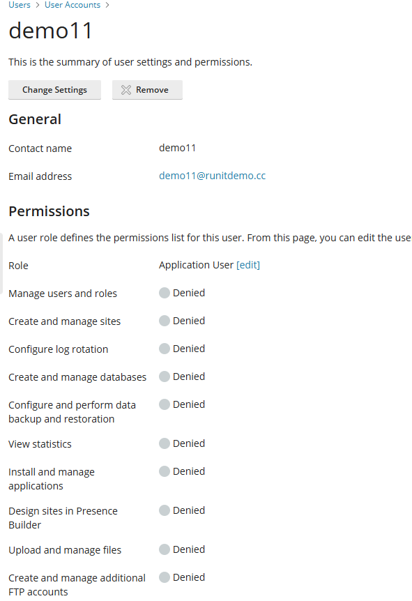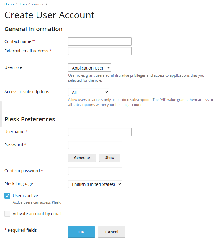 To create a user account: Log in to Plesk Find Users > Create User Account Enter Contact name, email address, Username, user password and click OK. You may change settings inside.