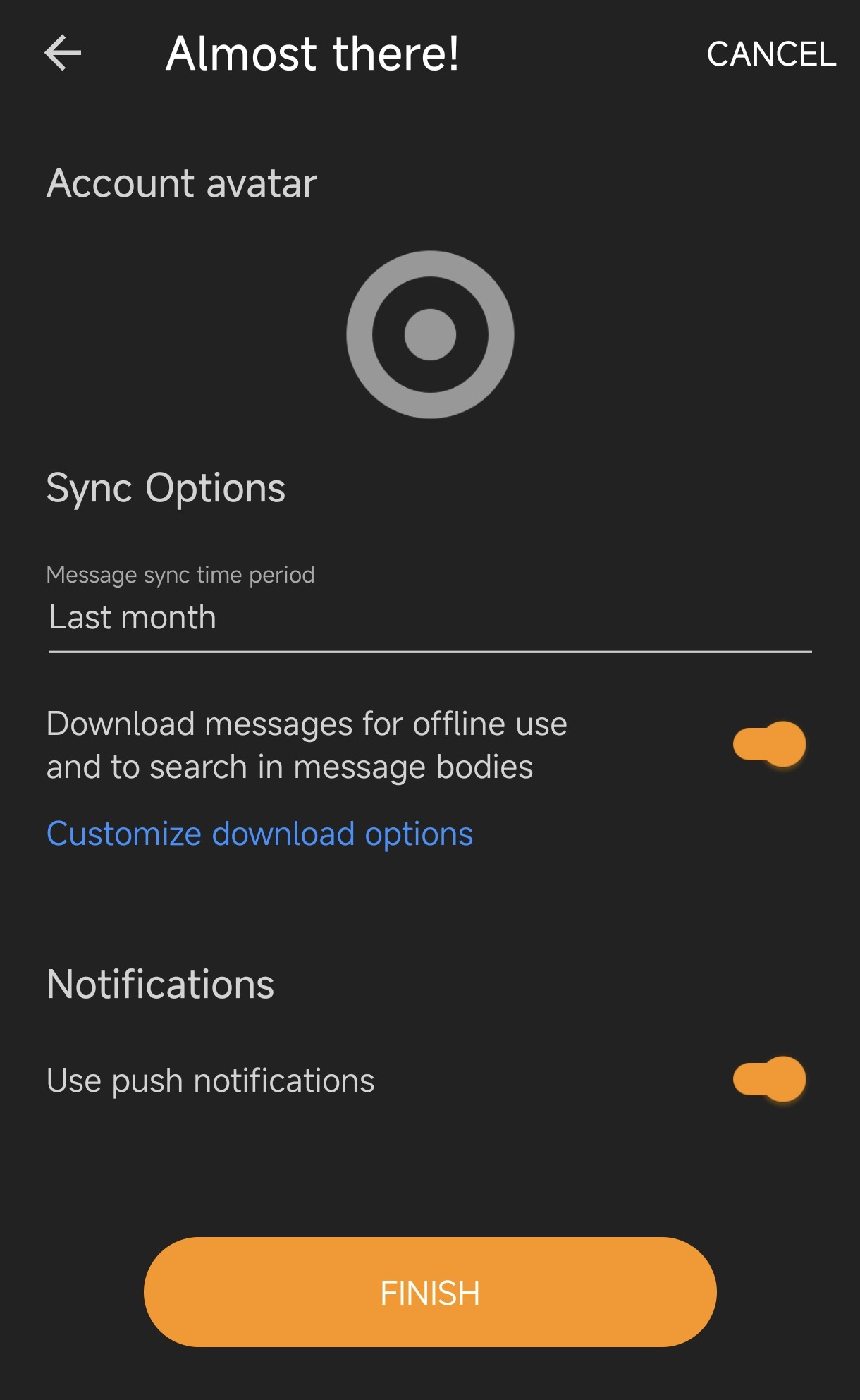 - Account Details > Enter display name > Next > Finish