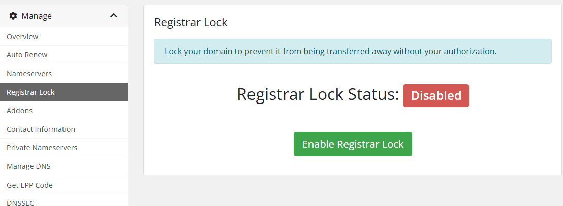 - Choose Registrar Lock > Choose Enable or Disable
