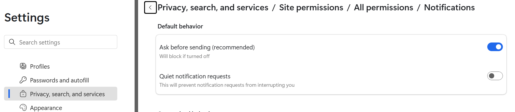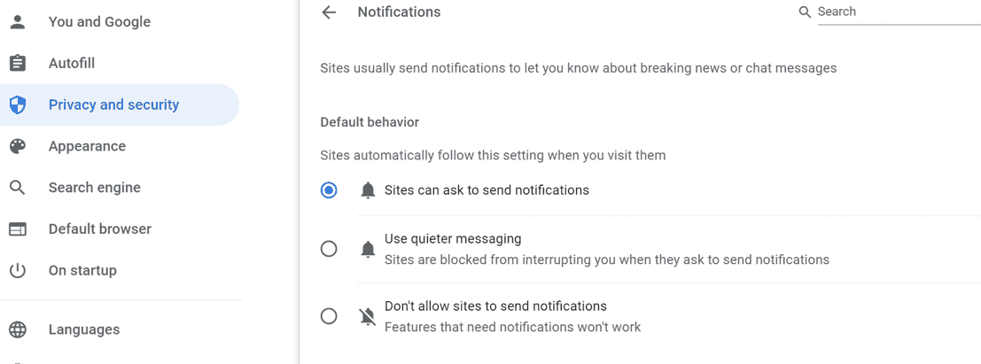 - A window will open showing websites that have requested notification permissions.