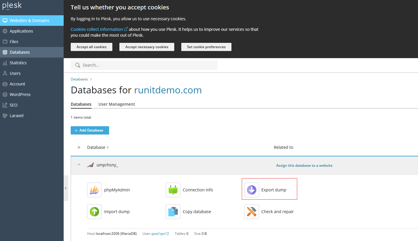 - Go to Websites & Domains > Databases > Export Dump in the database tools pane.