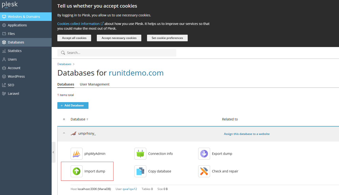 - Go to Websites & Domains > Databases > Import Dump in the database tools pane.