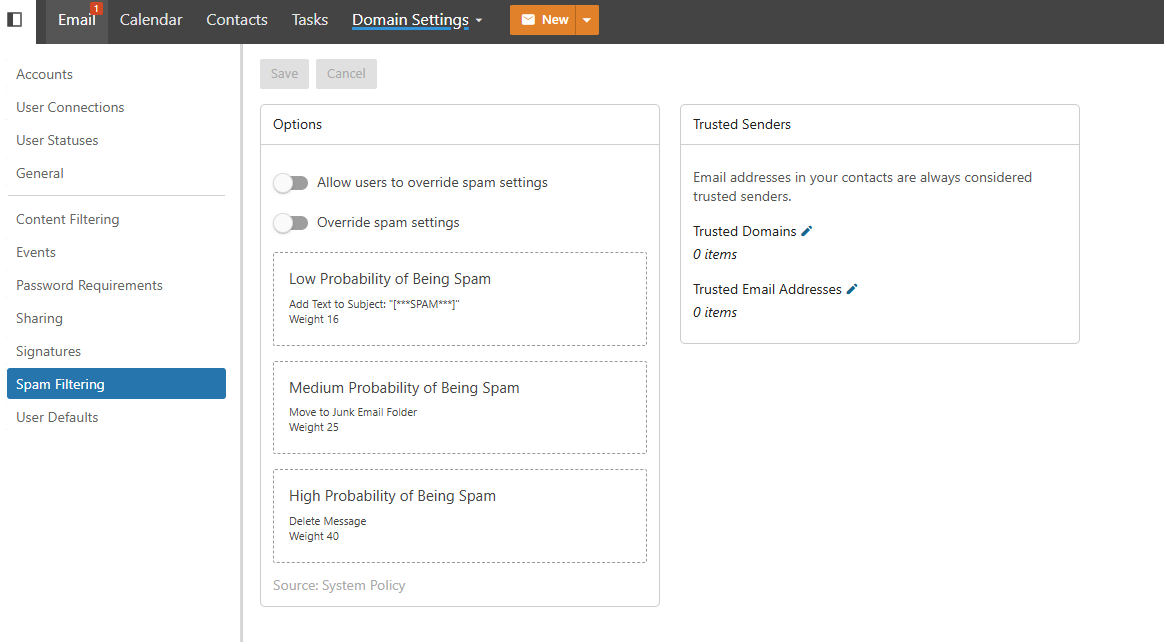 To adjust your SPAM filtering for your whole domain, follow these steps (administrative accounts only):