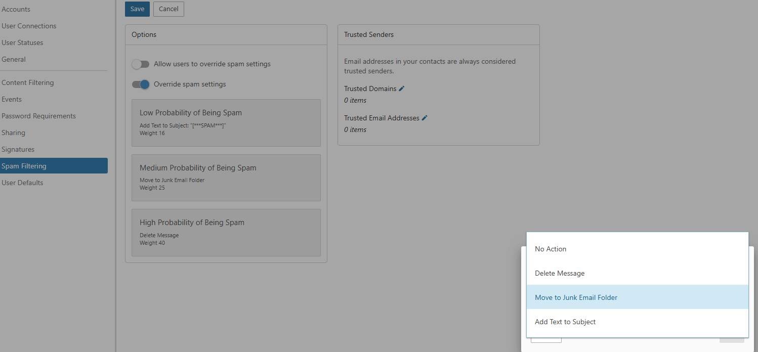 - Within the Options section, select Override filter weights and actions for this domain.