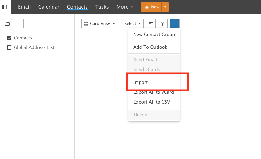 - In the Contact tab > Find (...) > Import.