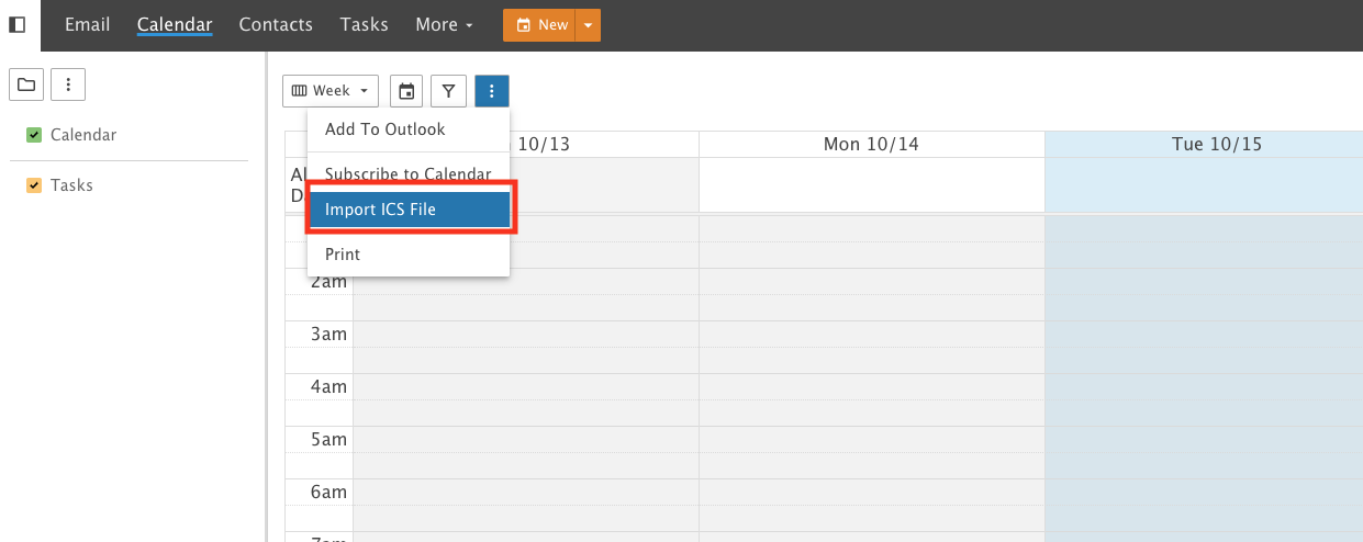 - In the Calendar tab > Find (...) > Import ICS File.