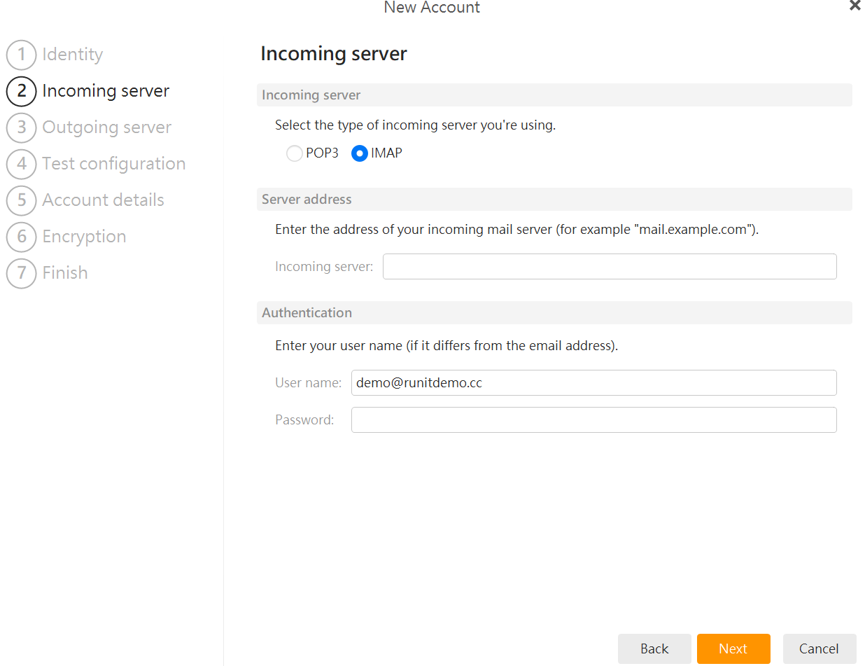 - Select IMAP or POP3 for the type of incoming server you're using and complete the remaining fields. Click Next.