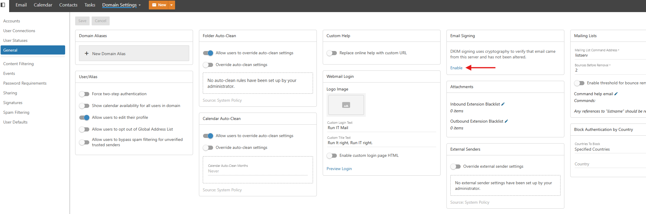 - On the Options tab, select the Enabled DKIM Signing checkbox.